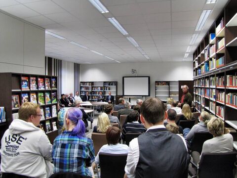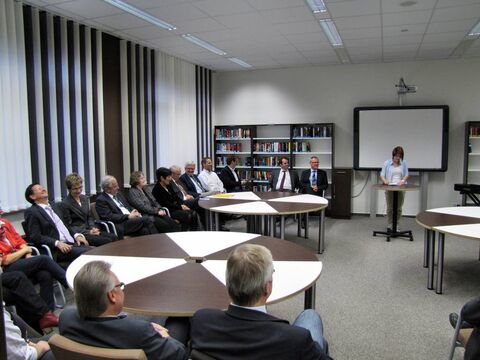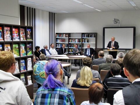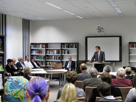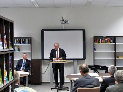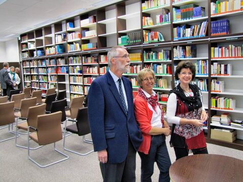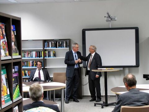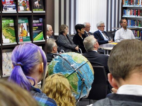 Ermöglicht wurde der Umbau durch das Engagement des Landkreises, der die Baumaßnahmen vornahm. Landrat Peter Bohlmann betonte in seinem Grußwort den Wert des Buches gerade in Zeiten des Internets und lobte die Zusammenarbeit mit Unternehmen und privaten Personen. Konkret meinte er die „Gerhard und Karin Matthäi Stiftung“, die in den letzten Jahren das Domgymnasium unter anderem mit elektronischen Tafeln und Laptopwagen ausgestattet hatte und nun die Einrichtung der Bücherei finanzierte. Neben Karin Matthäi und Dr. Friedrich Strube vom Stiftungsrat nahm Stiftungs-Vorstand Klaus Dröge an der Einweihung teil. Sein Geschenk: ein Glücks-Cent, gefunden auf dem Schulhof. Karin Matthäi sieht in der Schülerbücherei den Wunsch ihres Mannes (und damit der Stiftung), Jugendliche zu fördern, umgesetzt: „Bücher dienen zur Entspannung und Erweiterung des Wissens, aber mein Mann hätte zusätzlich noch einen E-Reader gehabt.“