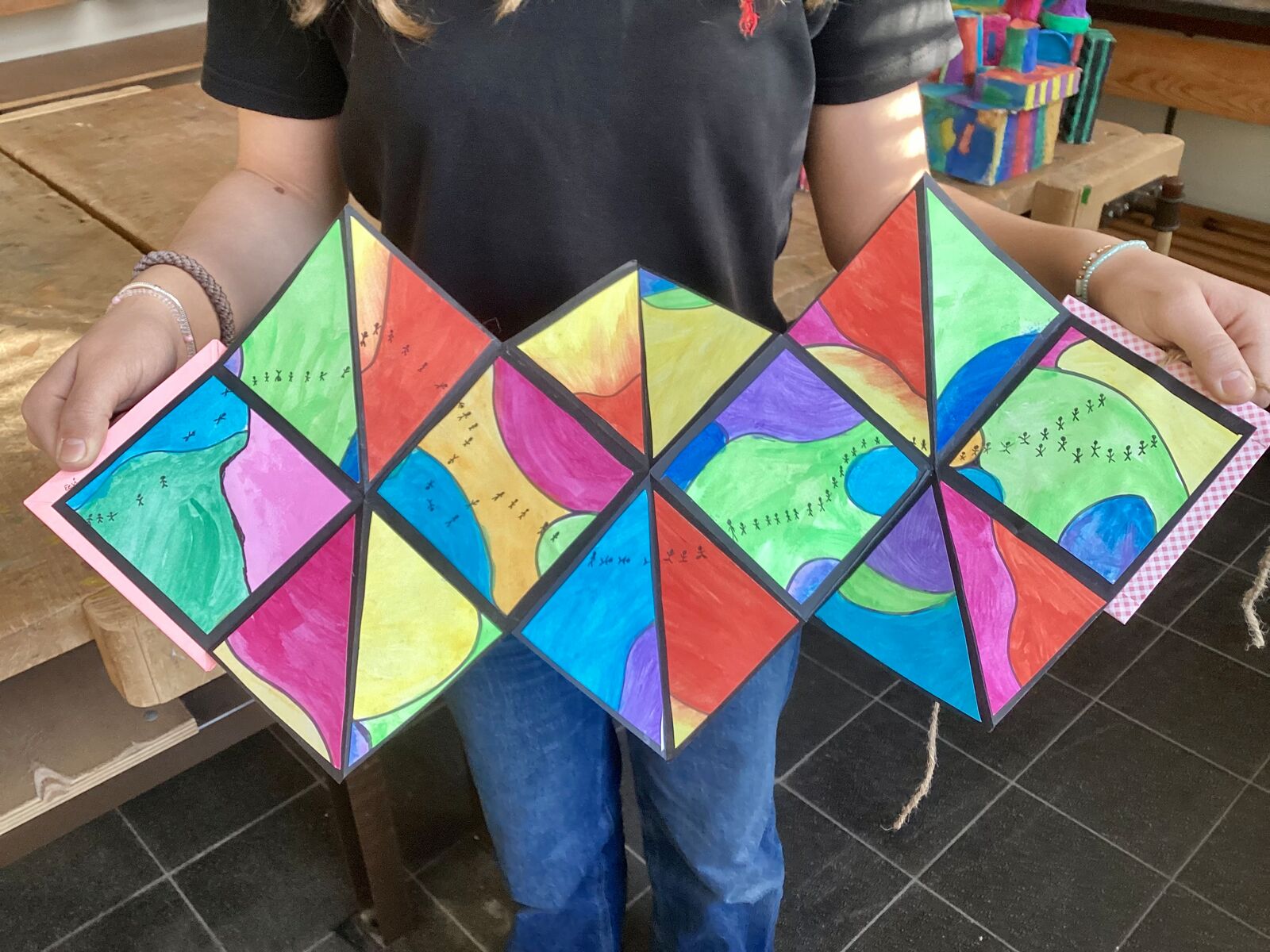 Das Bild des Monats im April ist ein "Explosion Book" von Eevi Dannehl (6d) zum Thema: Figuren in abstrakter Landschaft.