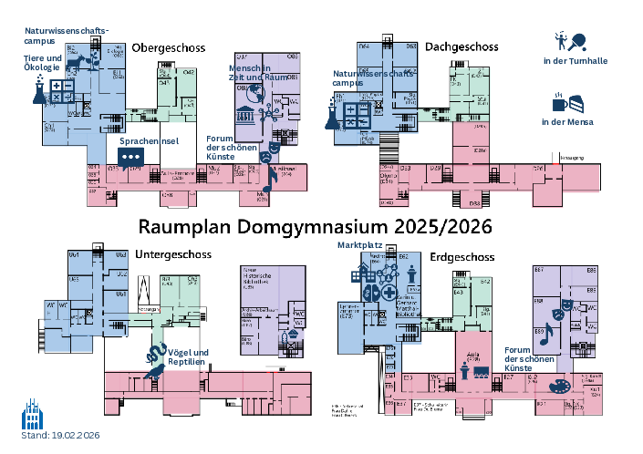 Wer das Domgymnasium am Tag der offenen Türen besuchen möchte, kann die Angebote, Ausstellungen und Informationen in den verschiedenen Themenbereichen mit Hilfe eines Leitsystems vor Ort sowie Überblicksplänen auf eigene Faust erkunden. Stärkung ist in der Mensa bei Kaffee und Kuchen oder mit einer Waffel auf die Hand im „Ziegenneubau“ möglich, und wie gehabt freuen sich zahlreiche Lehrkräfte und Schülerinnen und Schüler, bei der Orientierung in ihrer Schule behilflich zu sein. Zu erkennen sind sie an den grünen T-Shirts mit den eindeutigen Willkommensbotschaften.