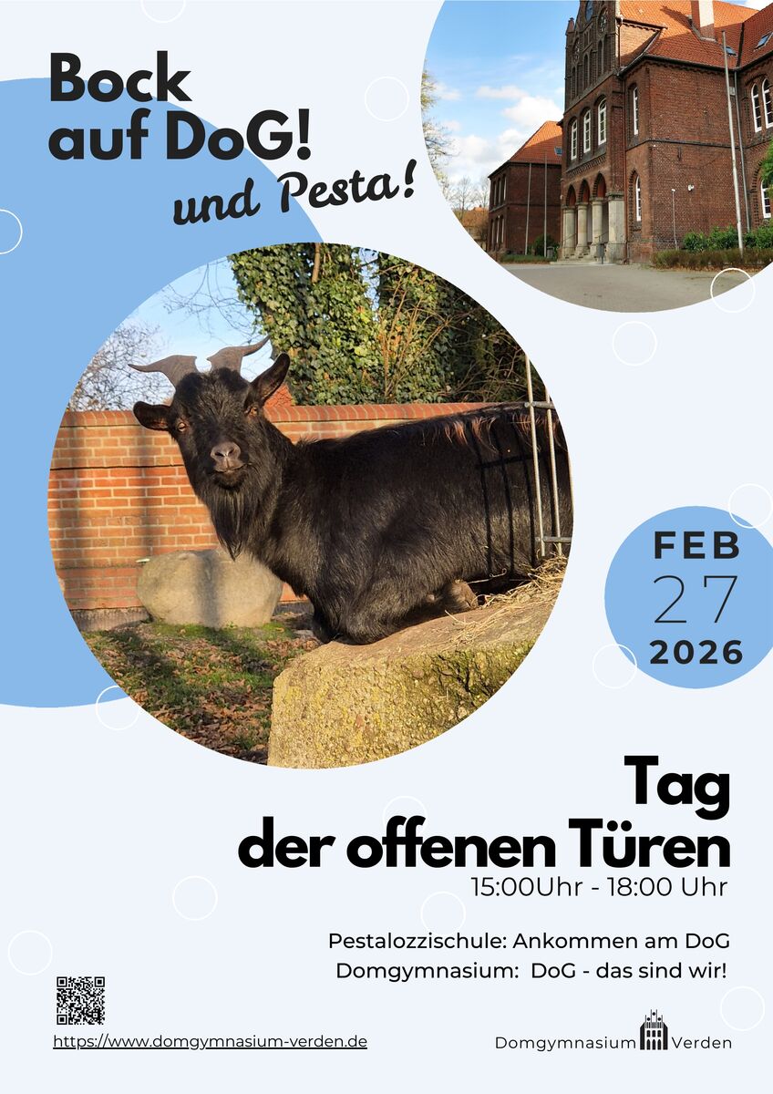 Am 27.02.2026 öffnen die Pestalozzischule in der Josefstraße 2 und das Hauptgebäude in der Grünen Straße 32 ihre Türen. Herzlich willkommen sind Familien mit Grundschulkindern, die im kommenden Jahr in die fünfte Klasse wechseln werden, ebenso wie alle anderen, die gerne einmal einen Blick auf das vielfältige Schulleben am Domgymnasium werfen möchten und ‚Bock auf DoG und Pesta‘ haben.